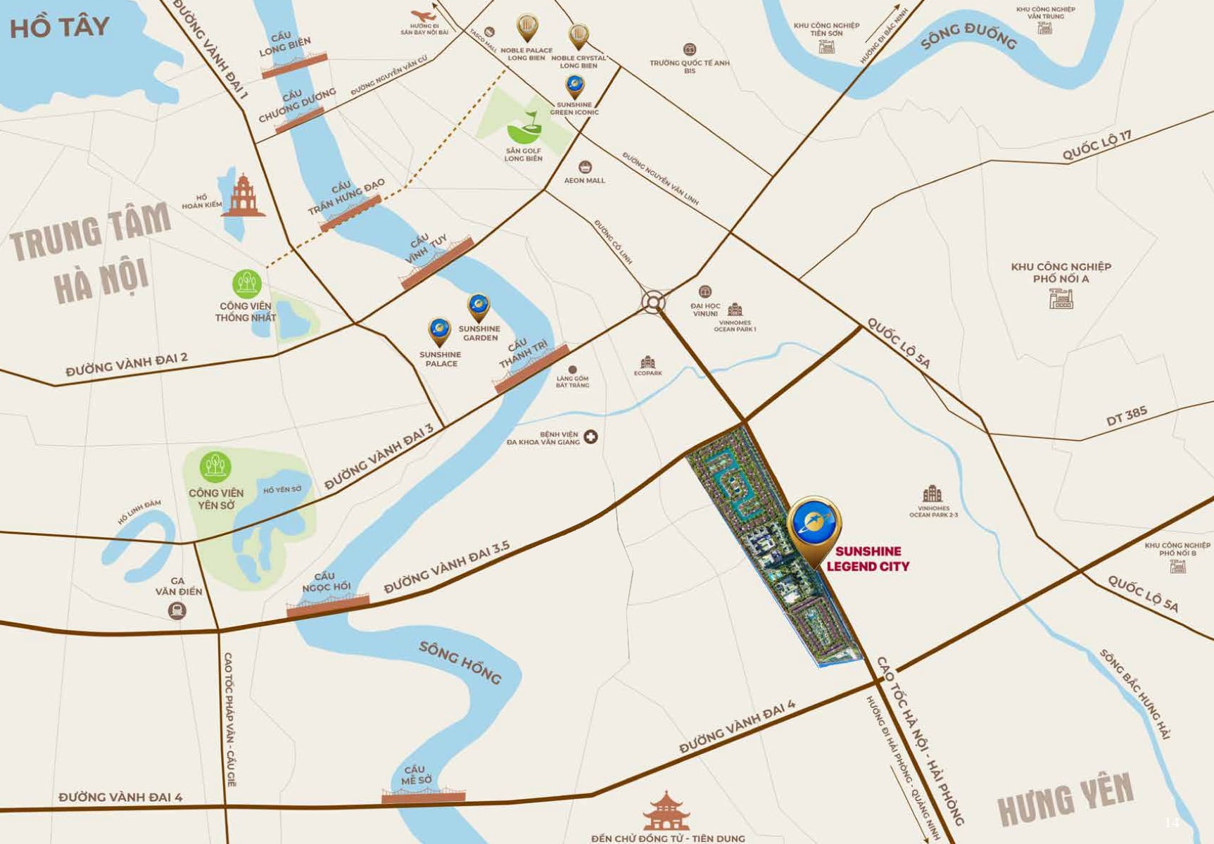 Sunshine Legend City sở hữu vị trí đắc địa tại trung tâm huyện Văn Giang, Tỉnh Hưng Yên, nơi có hệ thống giao thông đồng bộ và kết nối thuận tiện. Dự án nằm giữa vành đai 3,5 và vành đai 4, gần các khu đô thị lớn như Vinhome Ocean Park 2, Ocean Park 3 và Ecopark, đồng thời tiếp giáp với đường cao tốc Hà Nội – Hải Phòng. Nhờ vậy, cư dân sinh sống tại Legend City có thể dễ dàng chuyển đến trung tâm Hà Nội và như các tỉnh lân cận mà không bị mất quá nhiều thời gian.